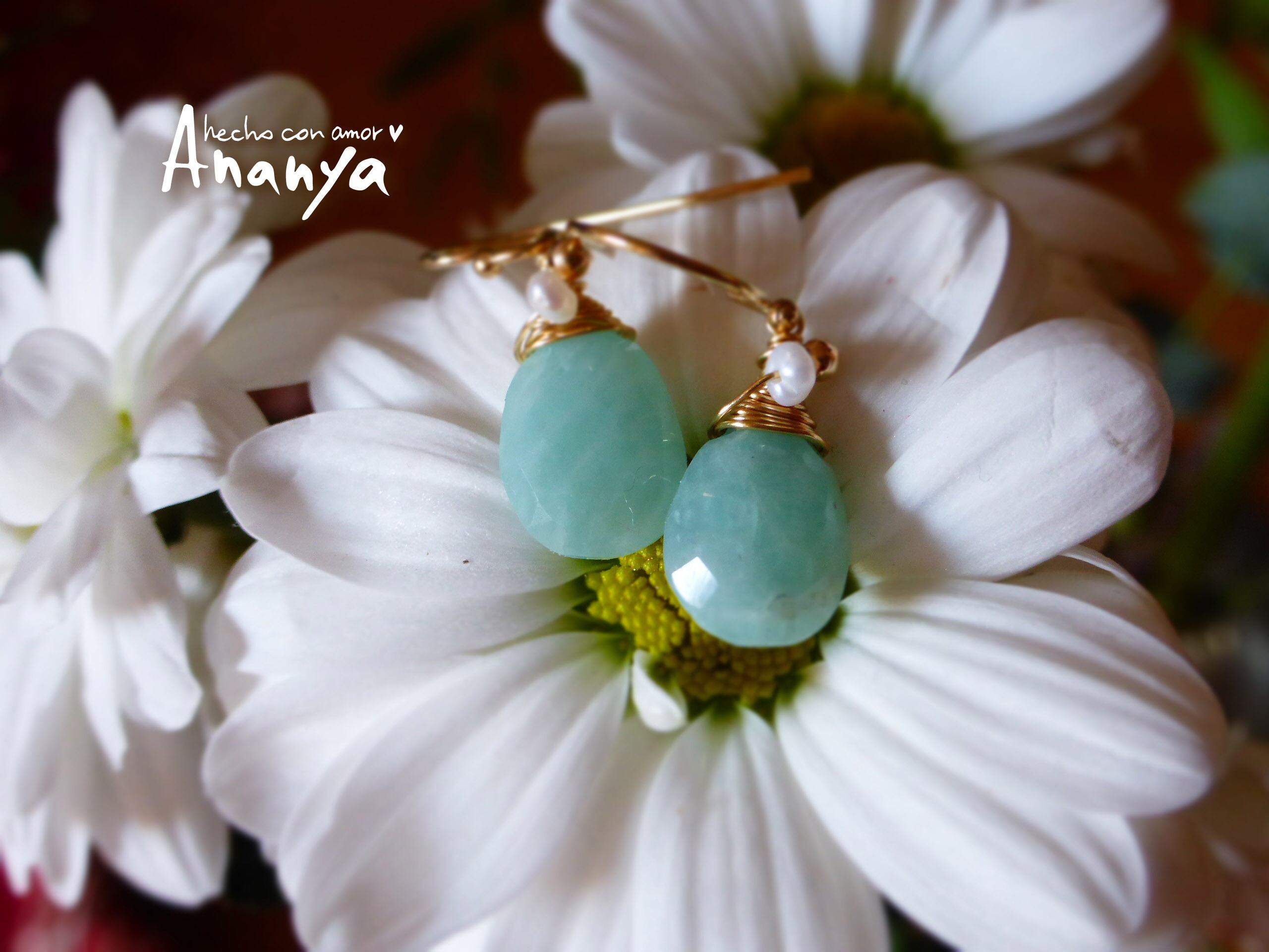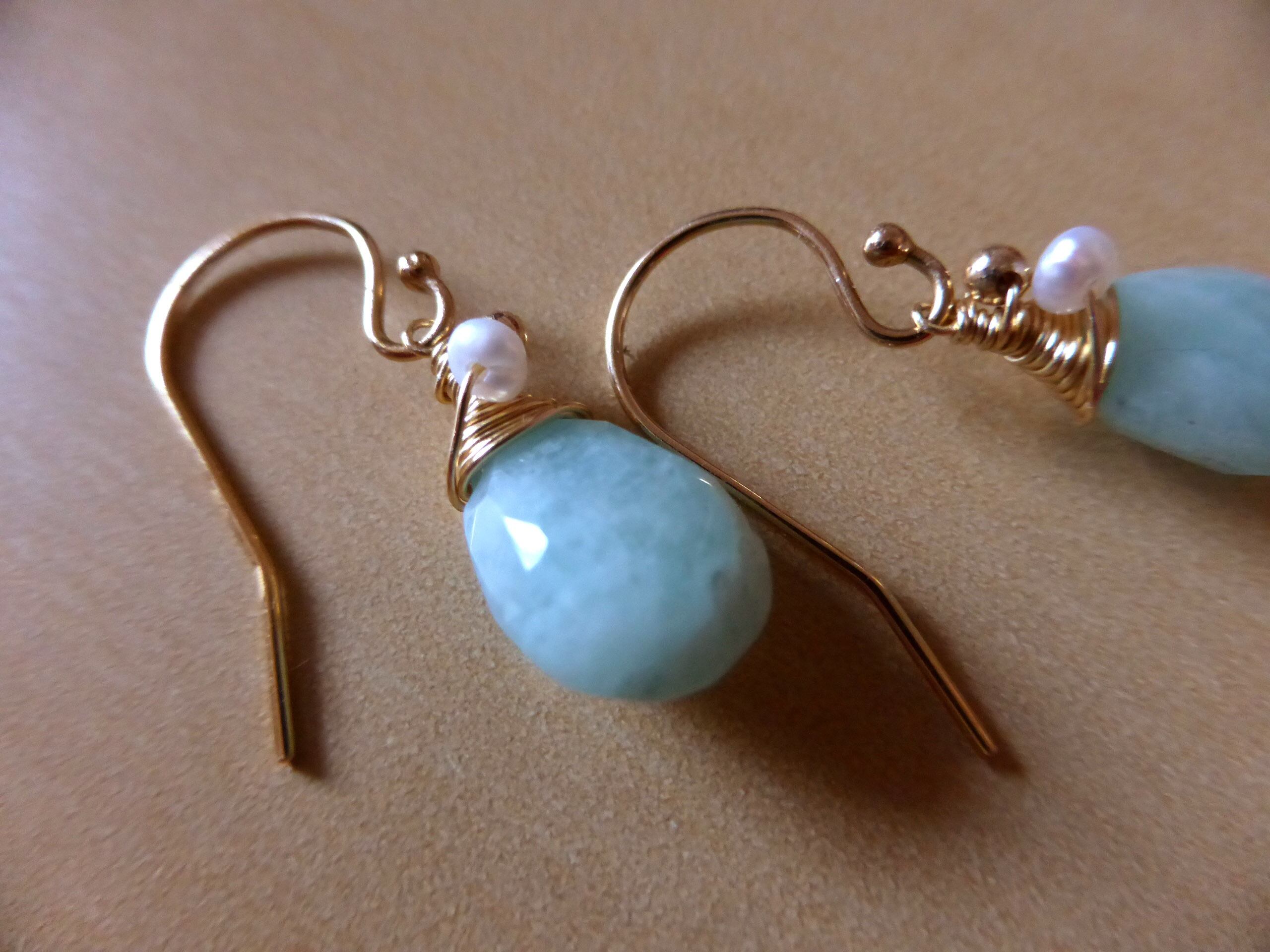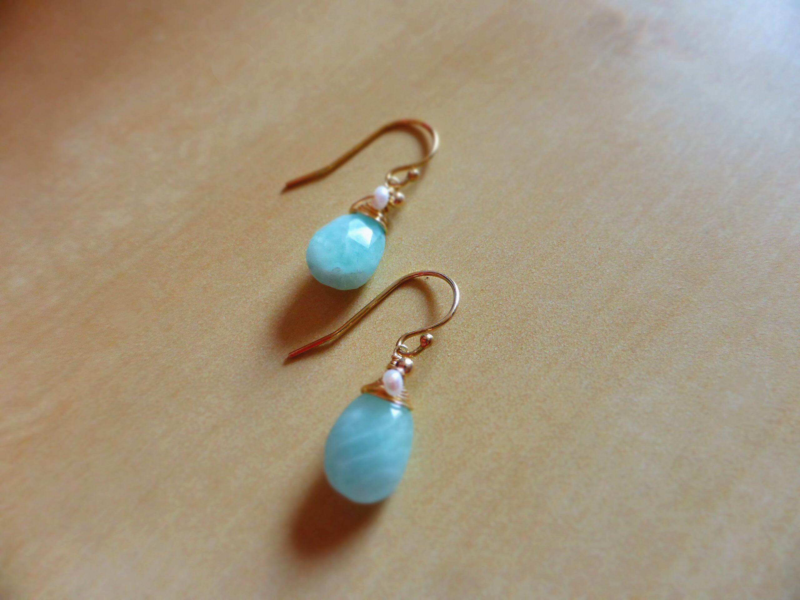アマゾナイト、淡水パール、14kGFビーズ、14kGFイヤーフック、14kGFワイヤー、シリコンキャッチ