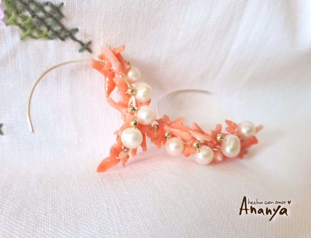 パールとゴールドのビーズの輝きが艶っぽさをプラスして、海に映る月光の輝きをイメージ。フープは満月の輪郭を表現し、美しいサンゴを神秘的なマーメイドの象徴として、また、身につけていそうなアクセサリーとして重ねてみました。