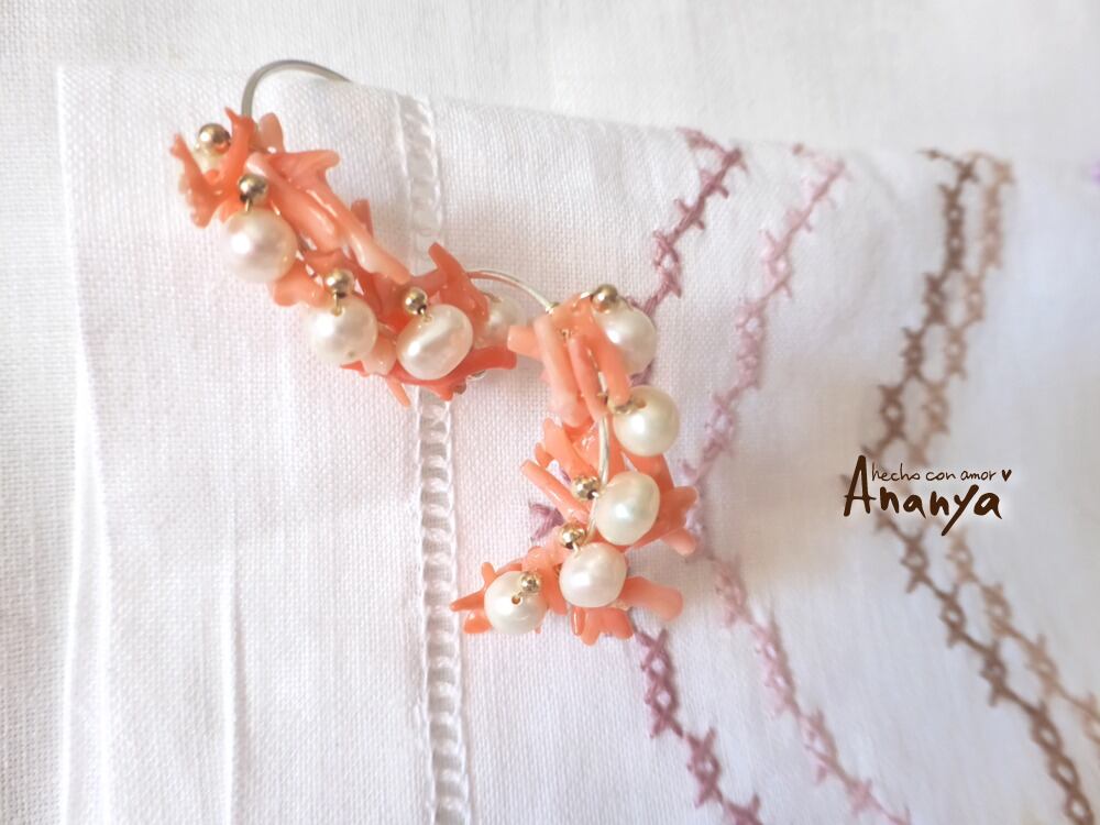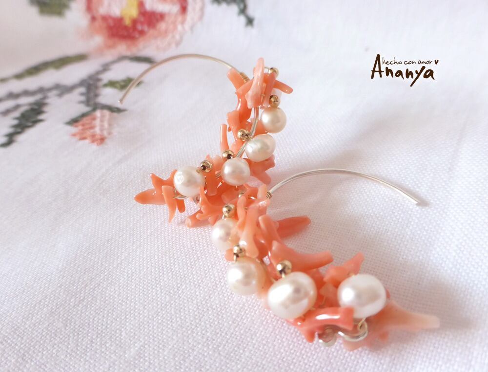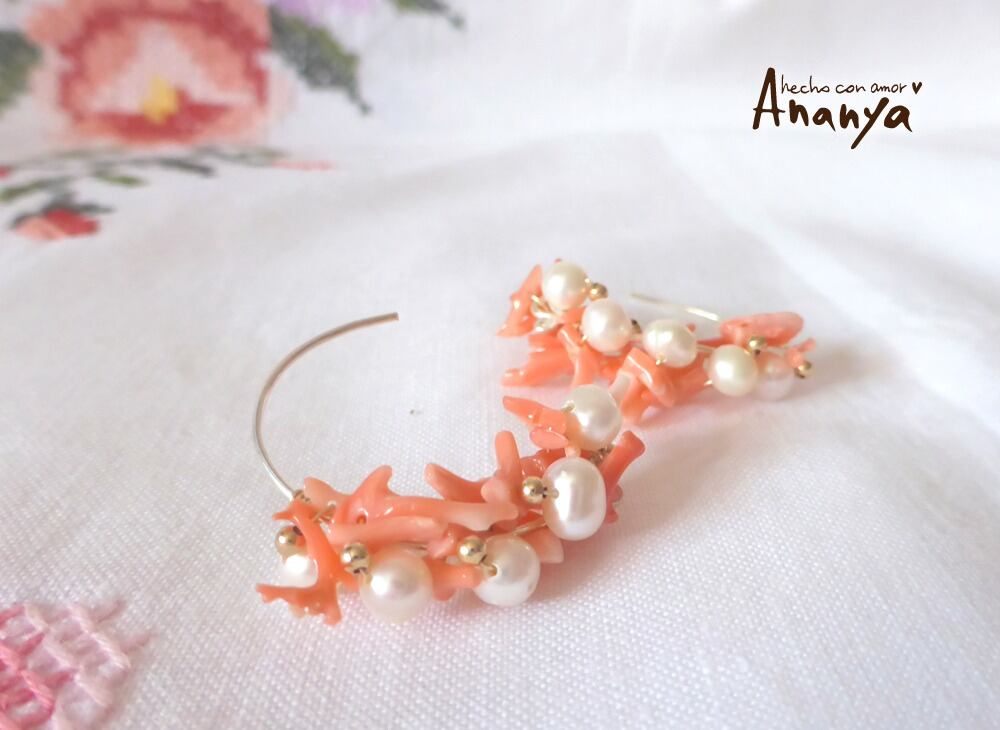 サンゴ、淡水パール、14KGoldFilledビーズ、14KGoldFilledワイヤー、シルバーフープピアス、シリコンキャッチ