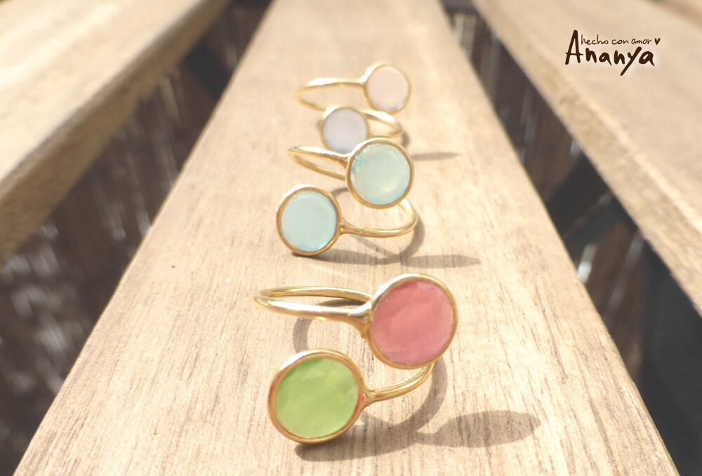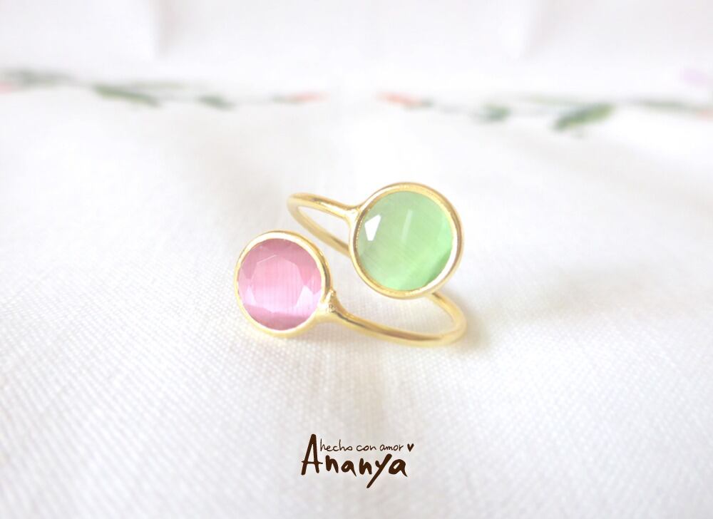 スライスカットのエメラルドとローズドフランスを、ゴールドメッキ枠で囲んで繋がっているリング。