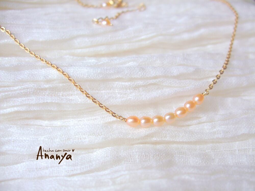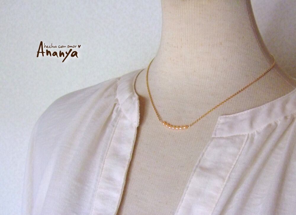 ほんのりとサーモンピンク色の本パールをシンプルに並べたネックレス。