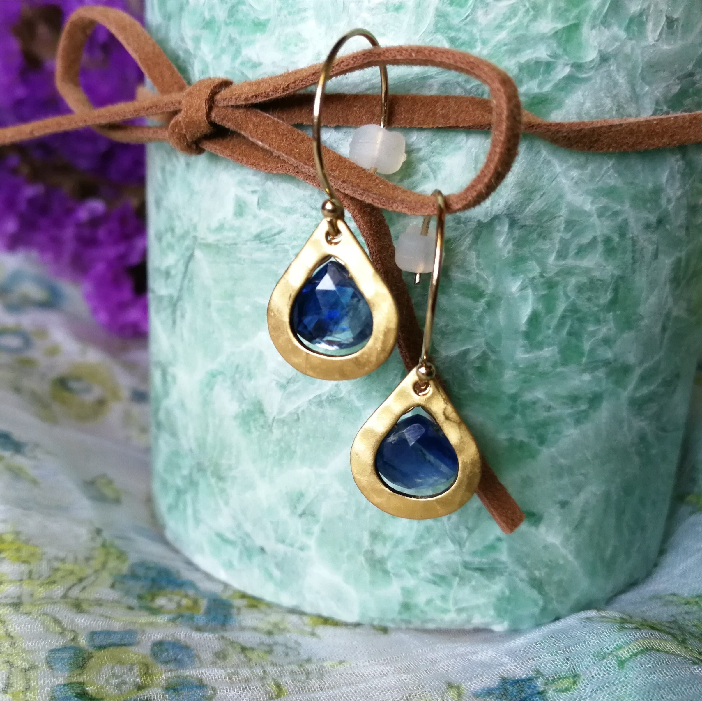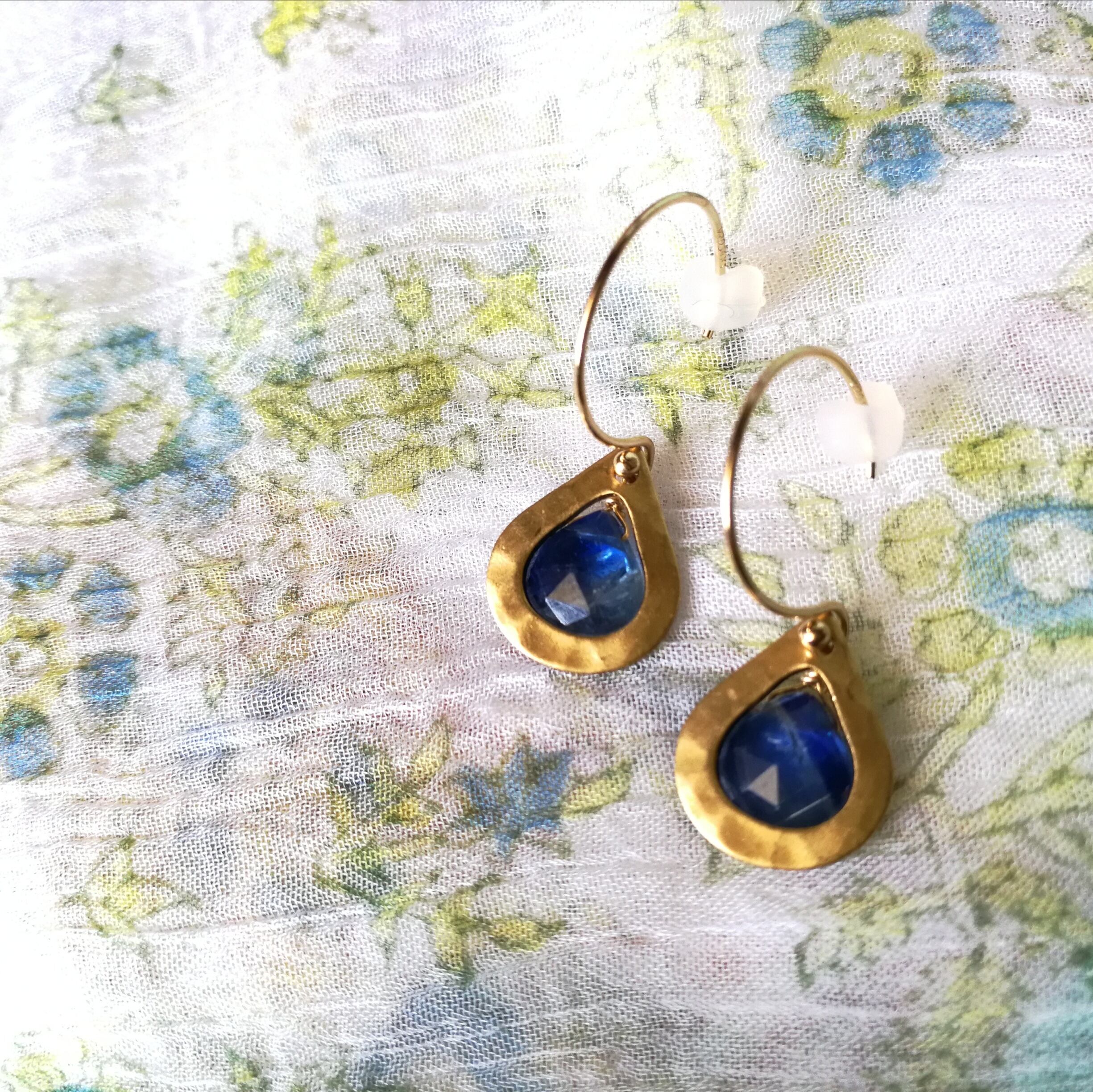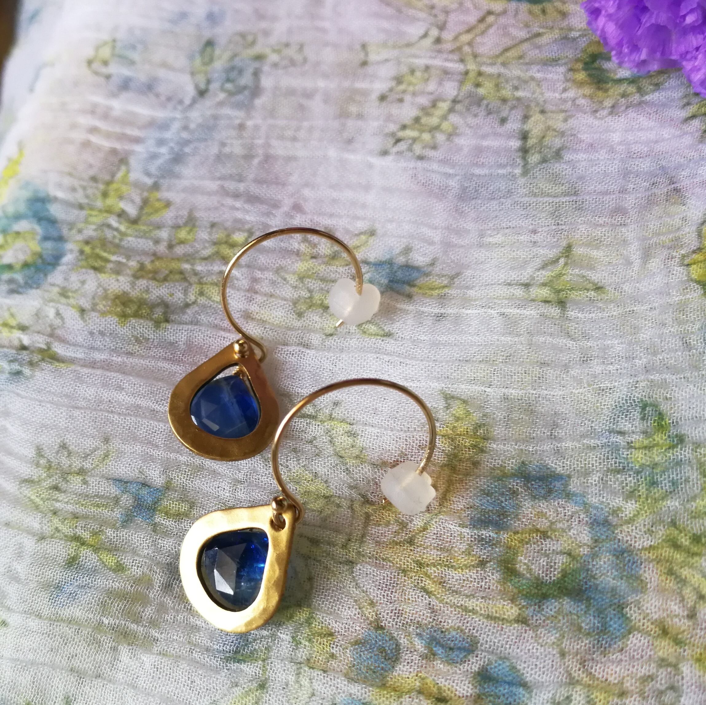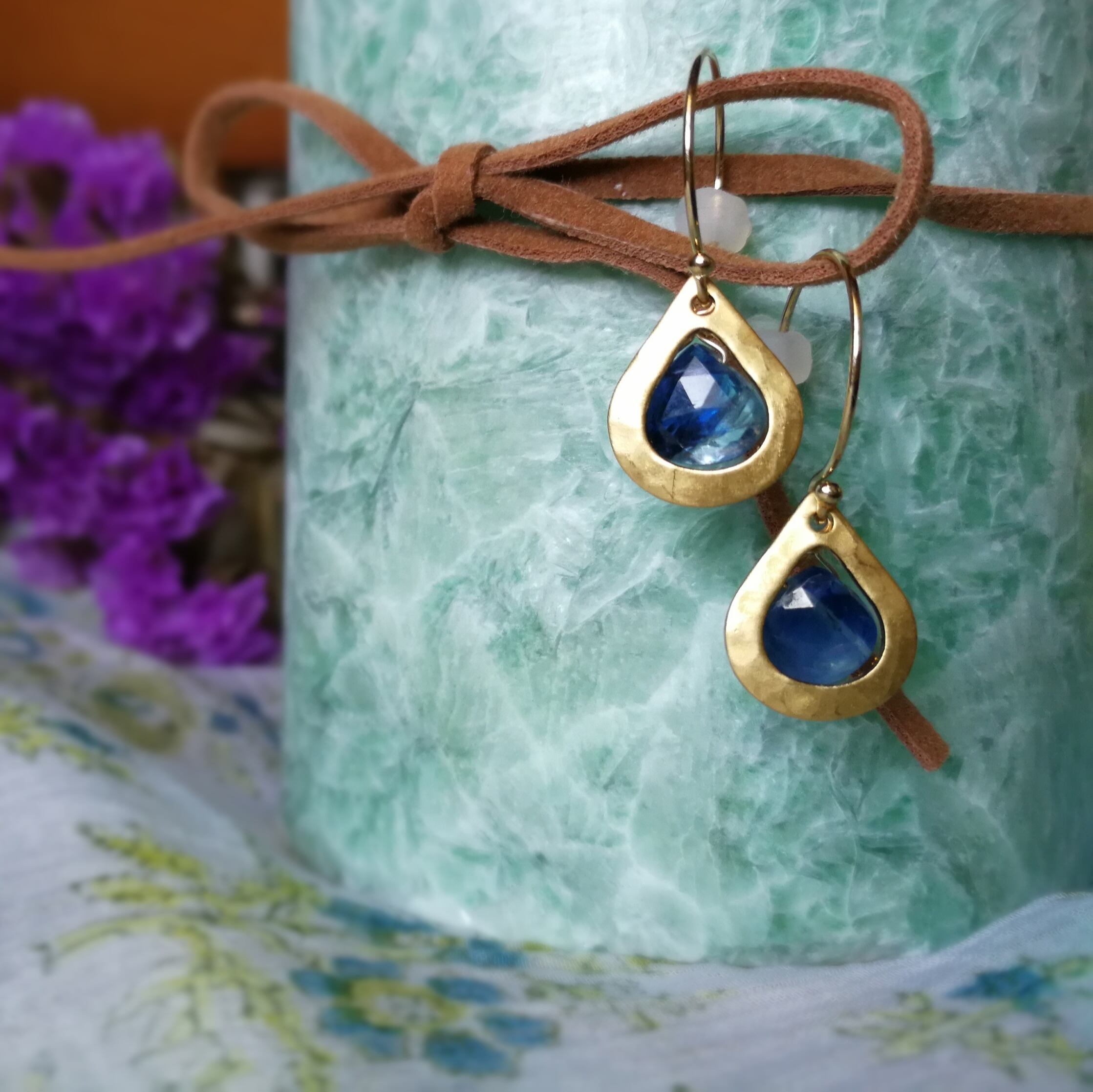 カイヤナイト、ハンマードブラス生地、14kGFイヤーフック、14kGFワイヤー