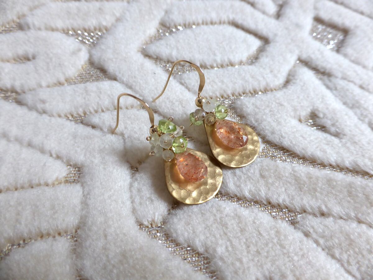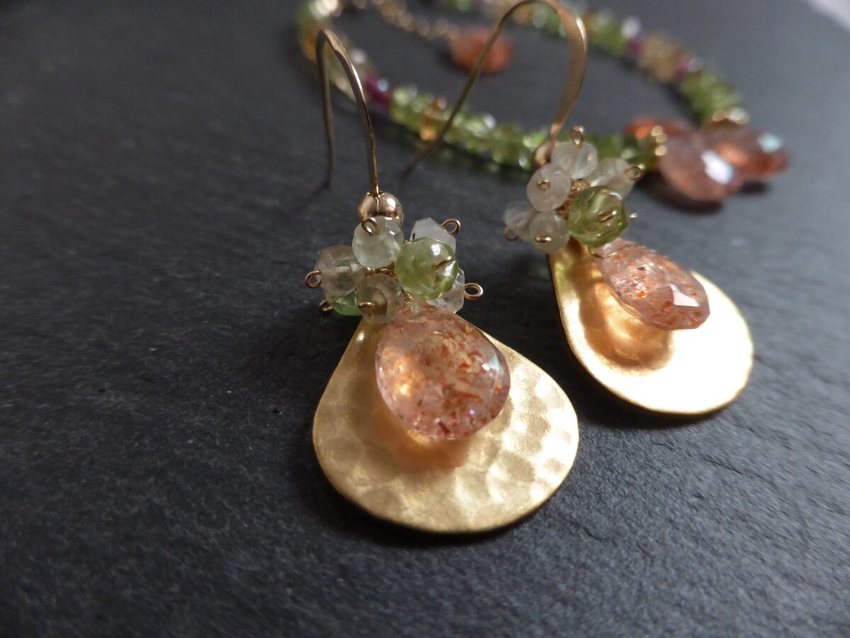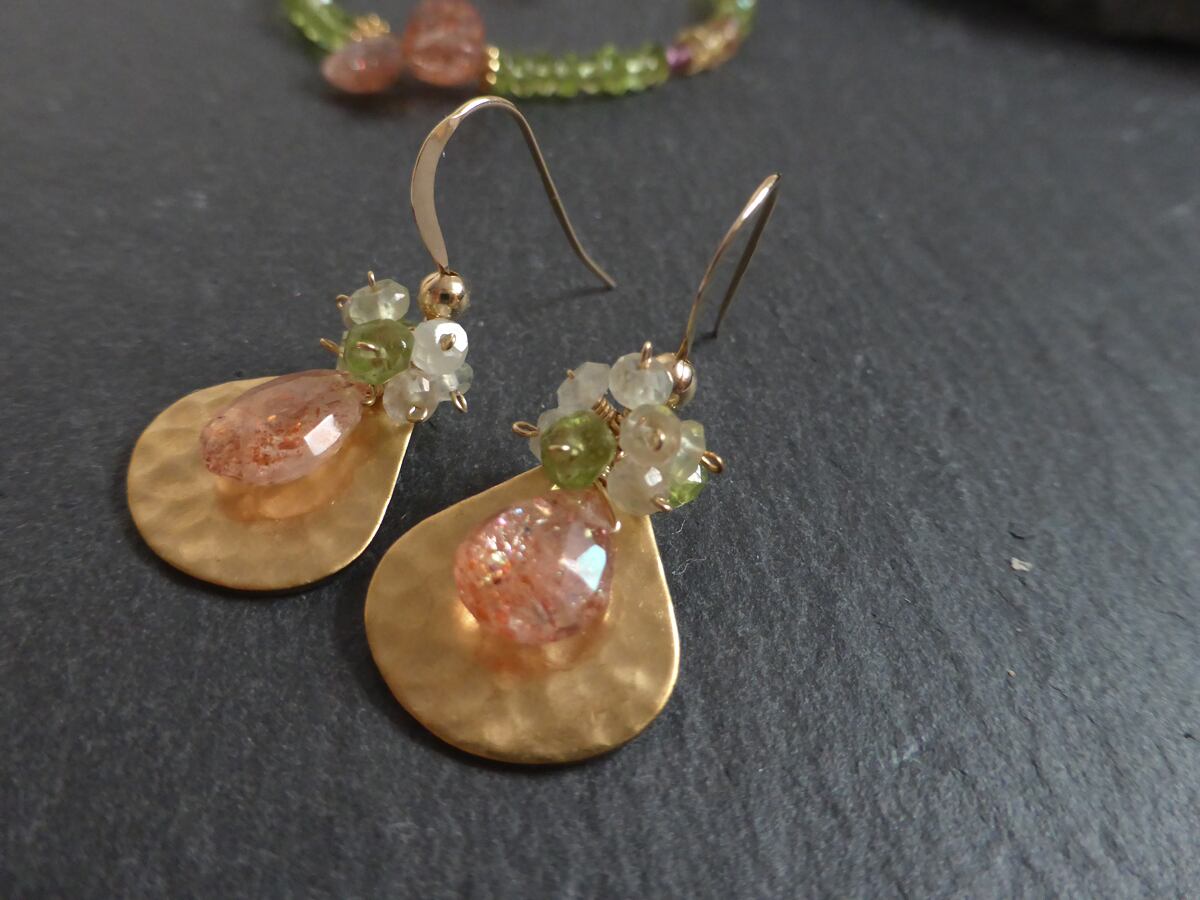 サンストーン、プレナイト、ペリドット、真鍮ハンマード、14kGF金具、