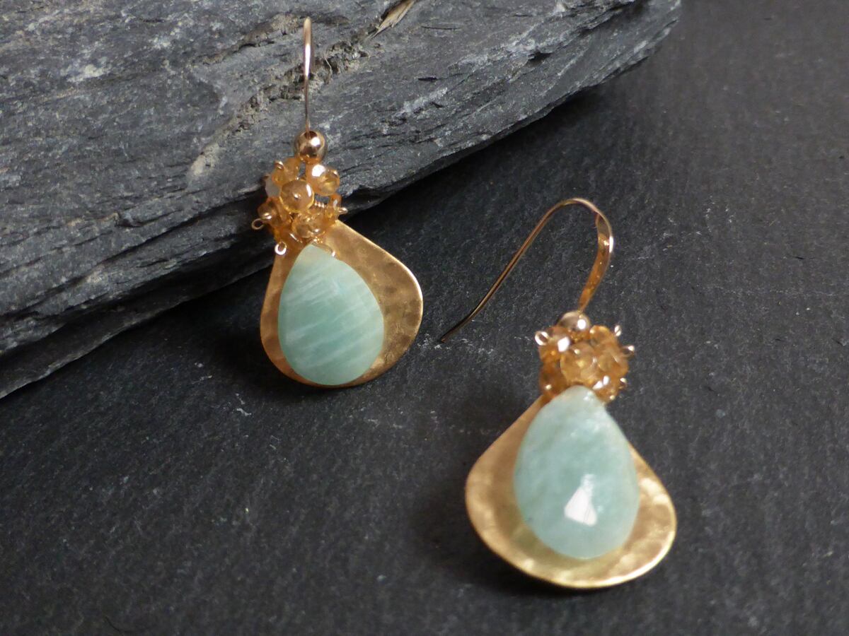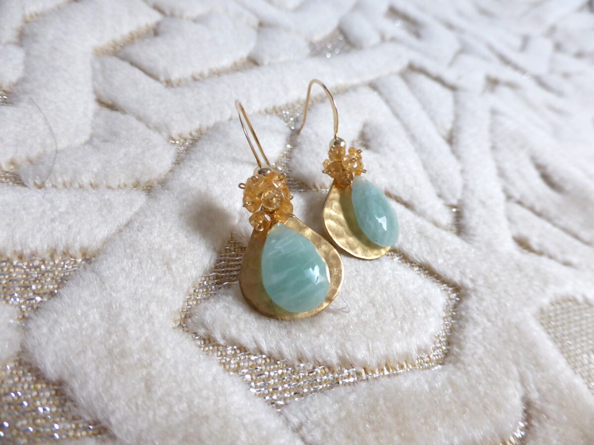 アマゾナイト、マンダリンガーネット、水晶、真鍮ハンマード、14kGF金具、