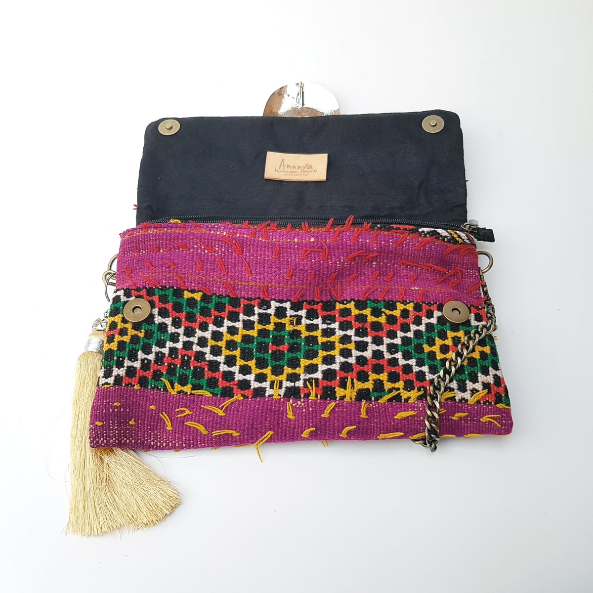 全面にキリムの布を使い、取り外し可能のショルダーストラップつき。
